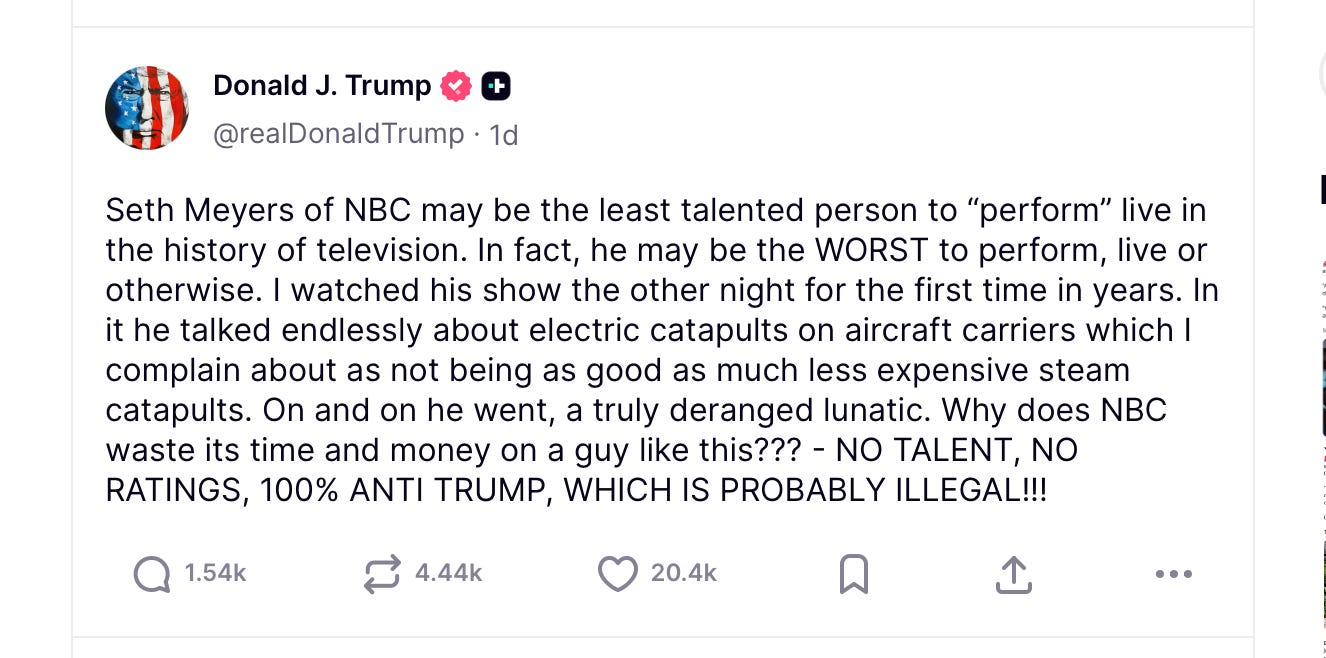 In this case, the message to NBC is loud and clear. Network executives are well aware that Trump has floated pulling broadcast licenses for major outlets and that his FCC has opened “content reviews” of networks critical of him. They’ve seen the president’s lawsuits against news organizations and historic capitulation settlements. So his post about Late Night is a message to the NBC higher ups: “I’m watching you!.”