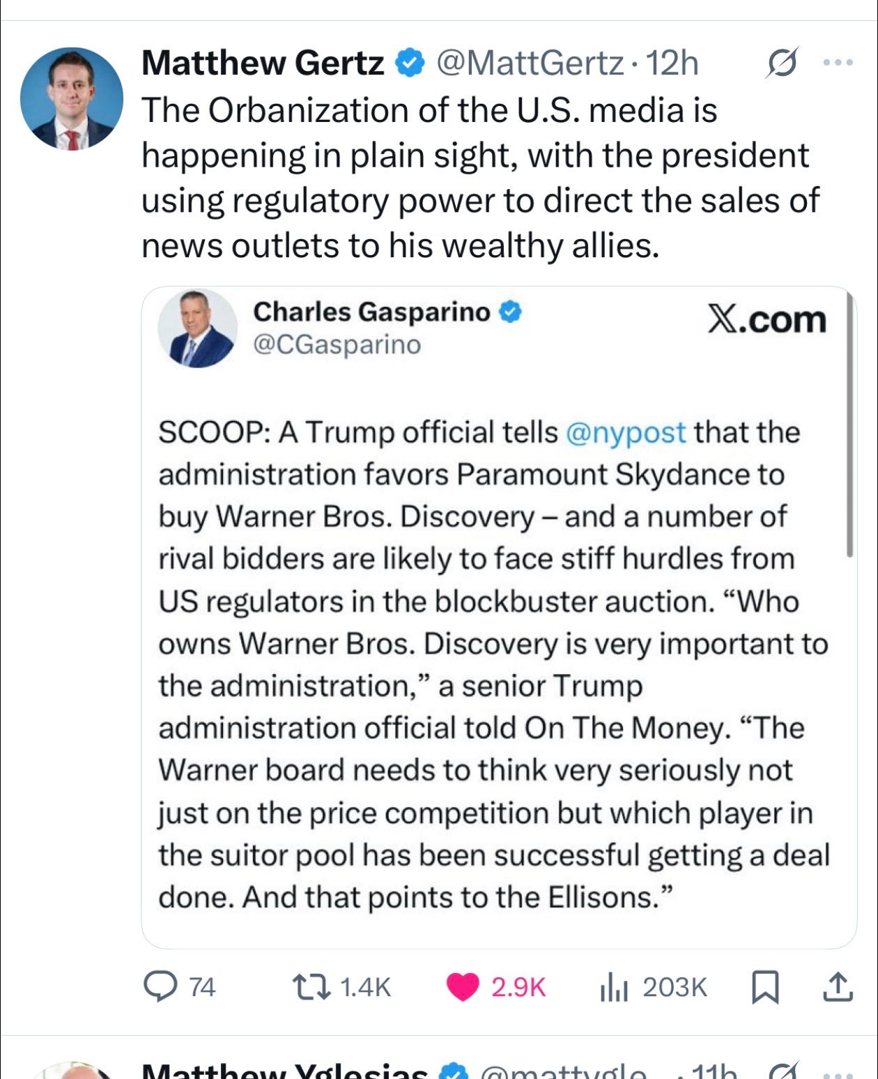 A senior Trump administration official told the New York Post that the White House favors Paramount Skydance (the same company that scooped up CBS) in its bid to acquire Warner Bros. Discovery, which is home to CNN, HBO, and other networks. Rival bidders, the source bragged, would face “stiff hurdles from U.S. regulators.” In other words, the president of the United States is now using federal power to engineer which of his wealthy allies will own which media outlets.