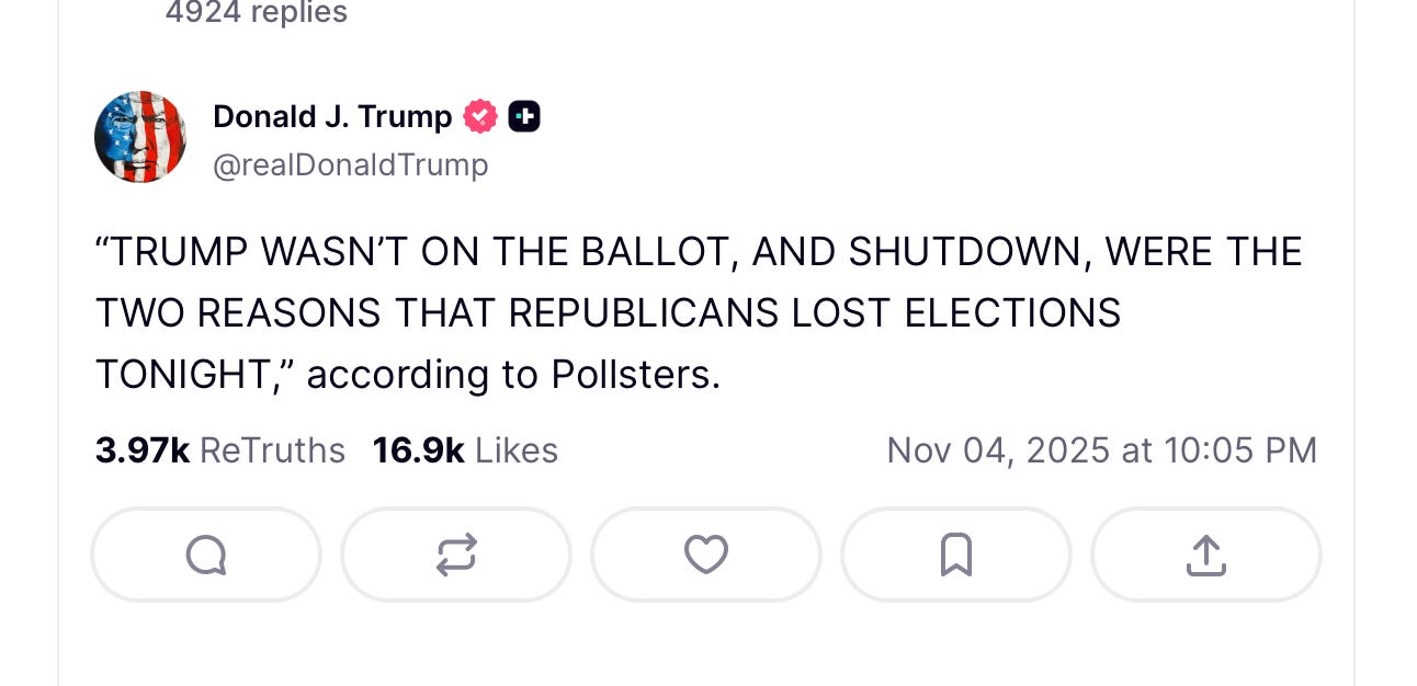 Last night delivered a message that Donald Trump is surely fretting about this morning. In fact, he even struggled to come up with a response to the Democrats’ election sweep in major races, suggesting feebly on Truth Social that the only reasons Republicans lost were because Trump himself wasn’t on the ballot and because of the shutdown. (See post, below). The latter claim was a shocking admission because he didn’t even bother to blame the Democrats for the government closure.